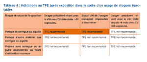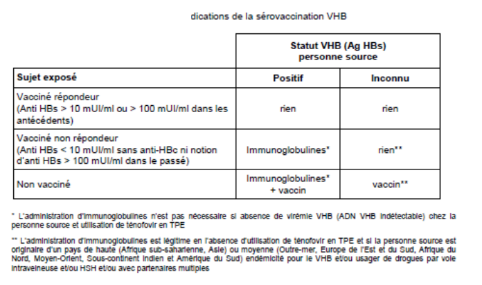 • Sérovaccination (Immunoglobulines anti HBS : 500 UI en IM + 1 vaccin Engerix B20 : 1 dose IM) si patient source connu porteur VHB (AgHBs+) et sujet exposé non vacciné ou non répondeur. Immunoglobulines non nécessaires si prescription de TPE (car ténofovir actif sur le VHB) ou si charge virale VHB indétectable du patient source.