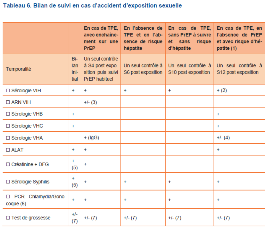 Victime AES : Sérologies initiales : VIH, VHB (Ag HBs, Ac antiHBs, Ac antiHBc), VHC, + syphilis si exposition sexuelle, + PCR Chlamydia/Gonocoque si agression sexuelle ET bilan pré-thérapeutique : ALAT, créatininémie, βHCG (si femme). A réaliser au SAU si indication d’un TPE (cf Fiche Synthèse) sinon donner ordonnance.